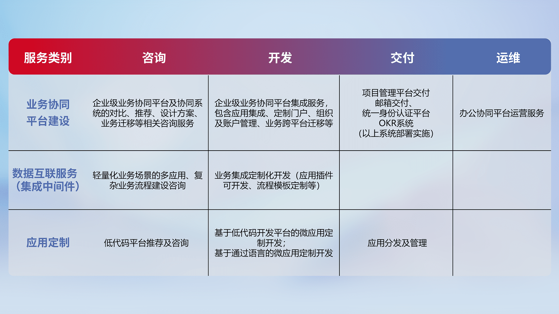 针对钉钉、、企微、、、、IDaas等平台级产品提供产品的规划、、方案、、、交付、、、、定制化开发等服务,,,实现如统一协同办公、、智能客户服务、、、、混合会议管理、、、、智能数据查询、、、、等业务场景,,实现数字化转型。。。